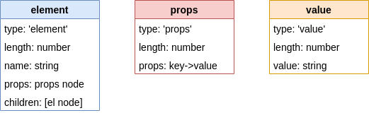 element,propsandvalue. Based on the node type we can also determine that additional properties that the node’s going to carry. In our parser, each node type should have the following additional properties: